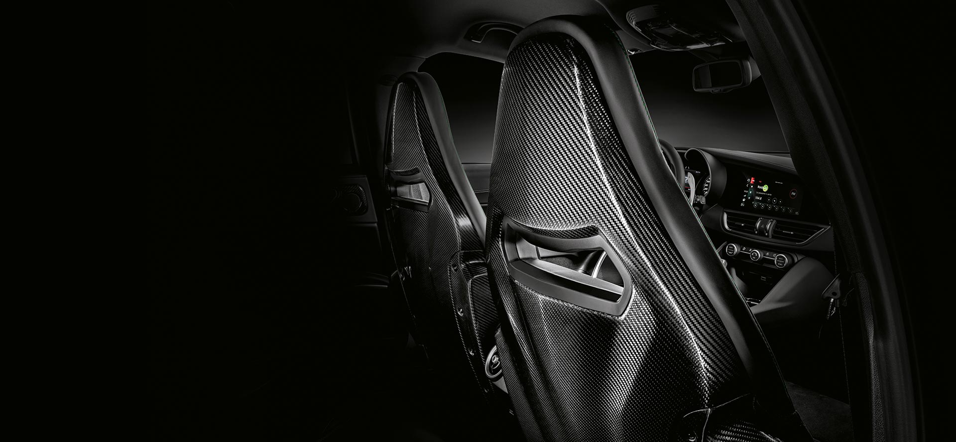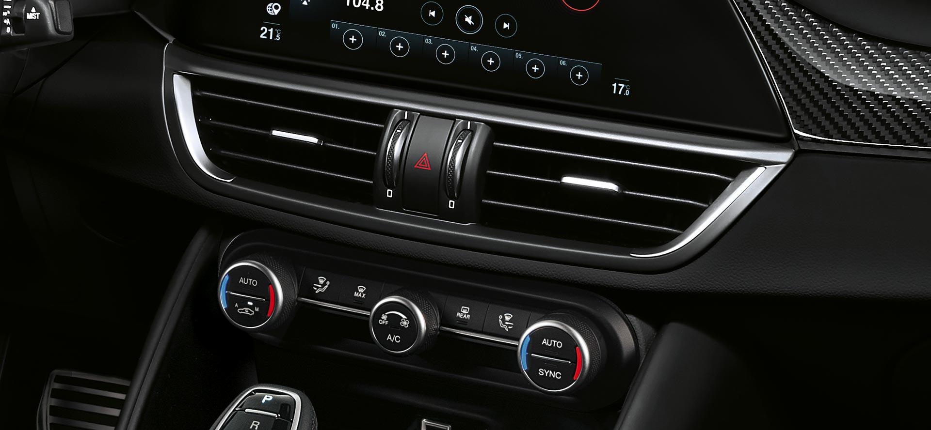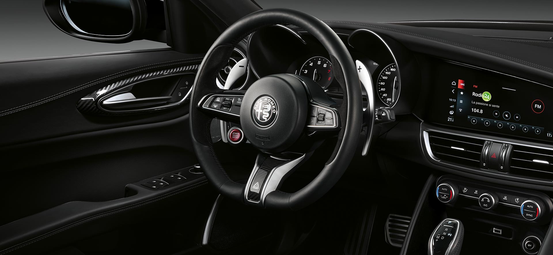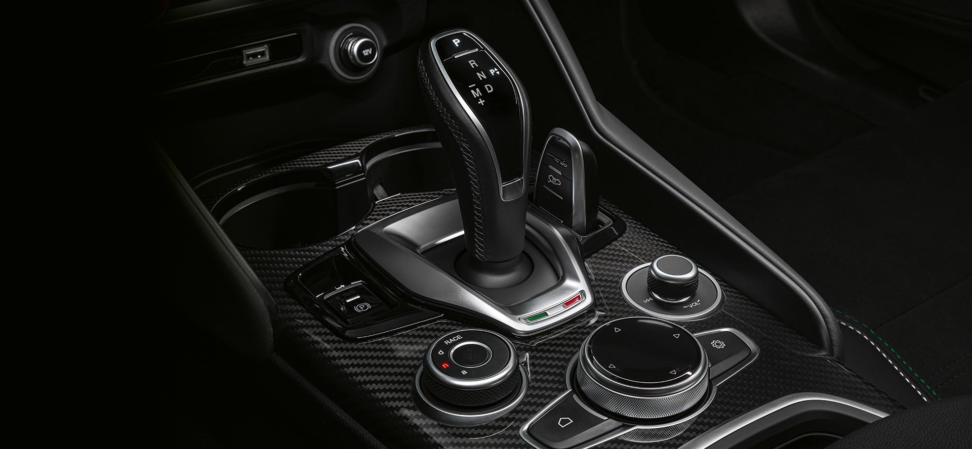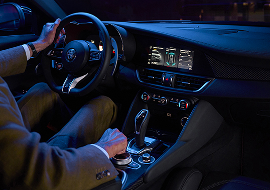 Giulia Quadrifoglio viduskonsole ir pilnībā pārveidota, izmantojot augstākās kvalitātes materiālus un oglekļa šķiedras elementus.
