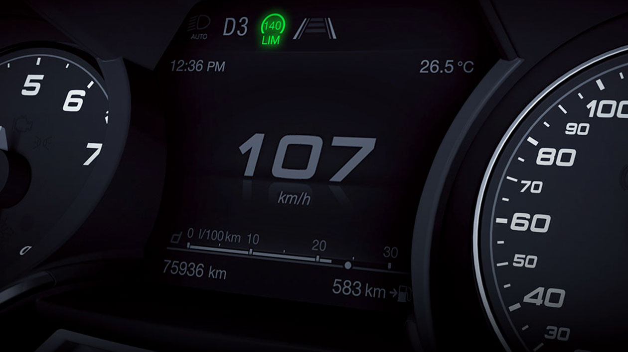 Ceļa zīmju atpazīšanas sistēma reāllaikā informē vadītāju par gaidāmajām atļautā braukšanas ātruma izmaiņām un aizlieguma zonām.