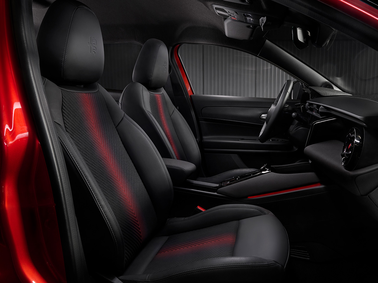 Sadarbībā ar Sabelt izstrādātie Corsa sēdekļi ir izgatavoti no melnas un sarkanas zamšādas, nodrošinot gan atbalstu, gan stabilitāti. Ar savu eleganto dizainu un izteiksmīgo sarkano šuvumu tie izstaro sacīkšu iedvesmotu izsmalcinātību.