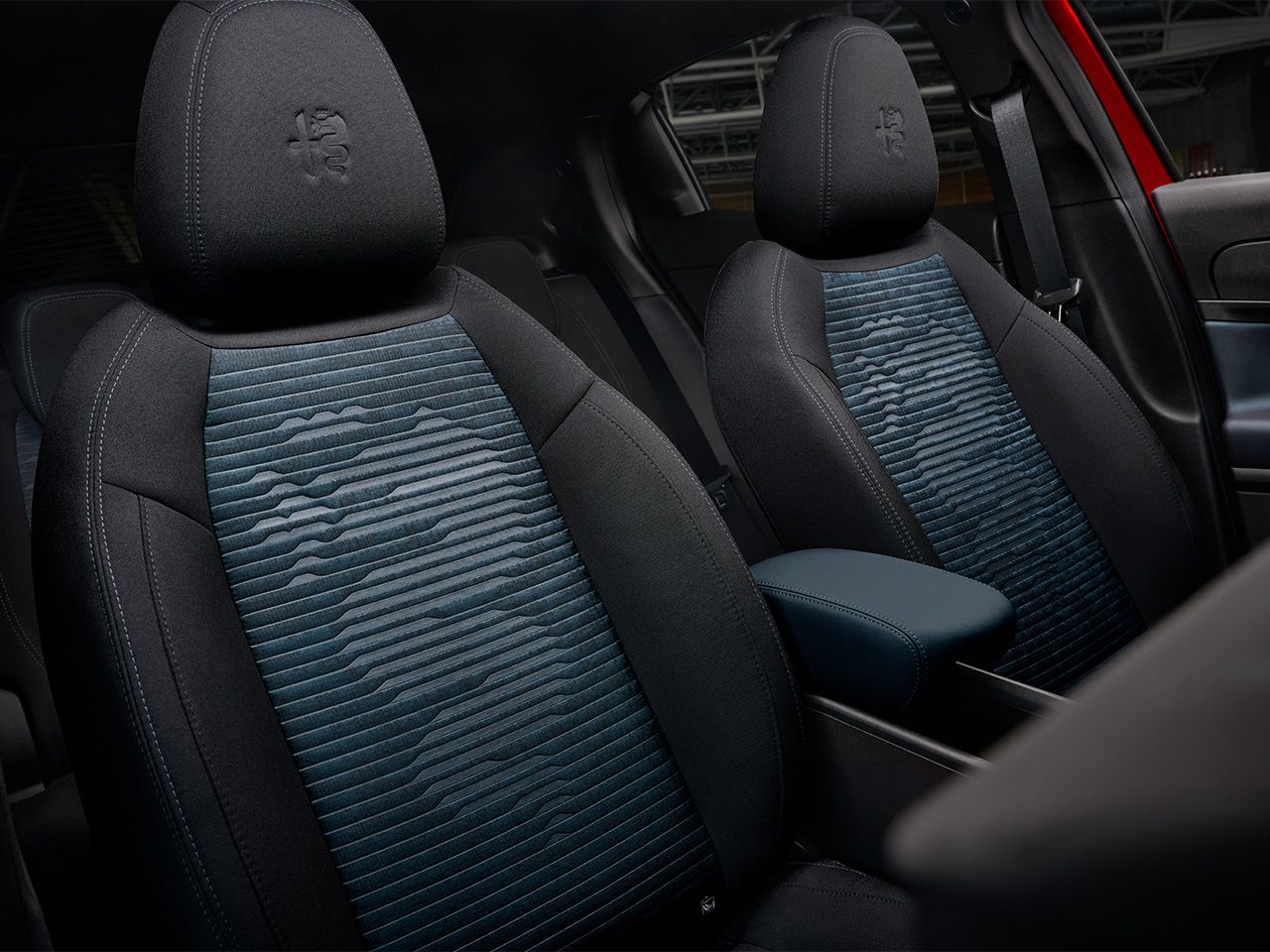 Modelim Icona raksturīgajiem, novatoriskajiem auduma sēdekļiem melnā un zilā krāsā ir uzmanību piesaistošs kamuflāžas efekts, kas greznots ar Biscione zīmola emblēmu.