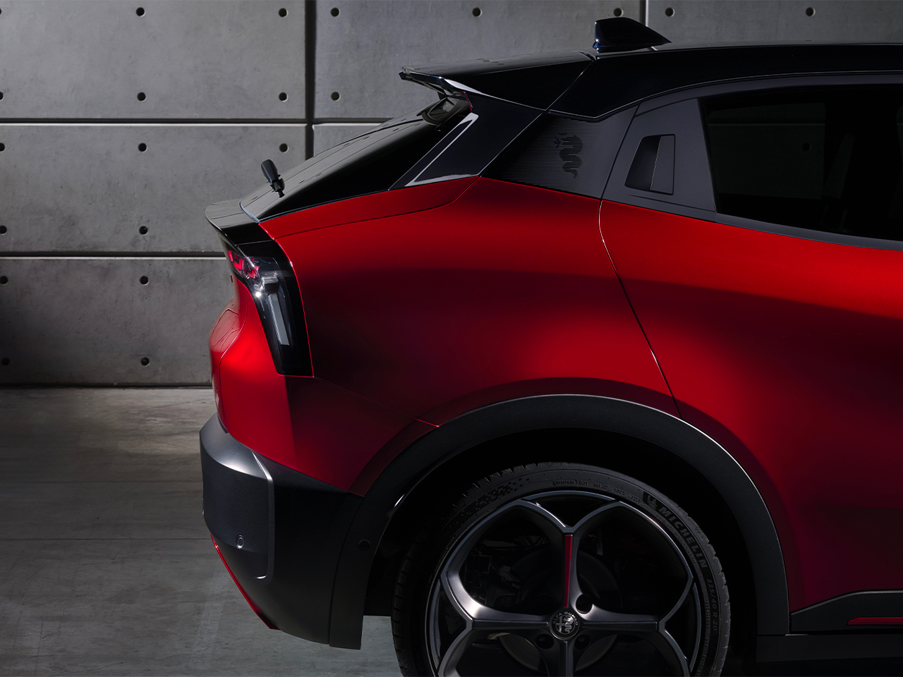 Elegantie aizmugurējie LED lukturi melnā krāsā iemieso mūsu nezūdošo sportisko pievilcību, ļaujot Alfa Romeo jaunajam Junior Elettrica skaidri izcelties no jebkura skata leņķa. Nevainojami integrēti Alfa Romeo Junior skulpturāli veidotajās kontūrās, izceļot tam raksturīgo profilu ar ikonisko Coda Tronca dizainu.