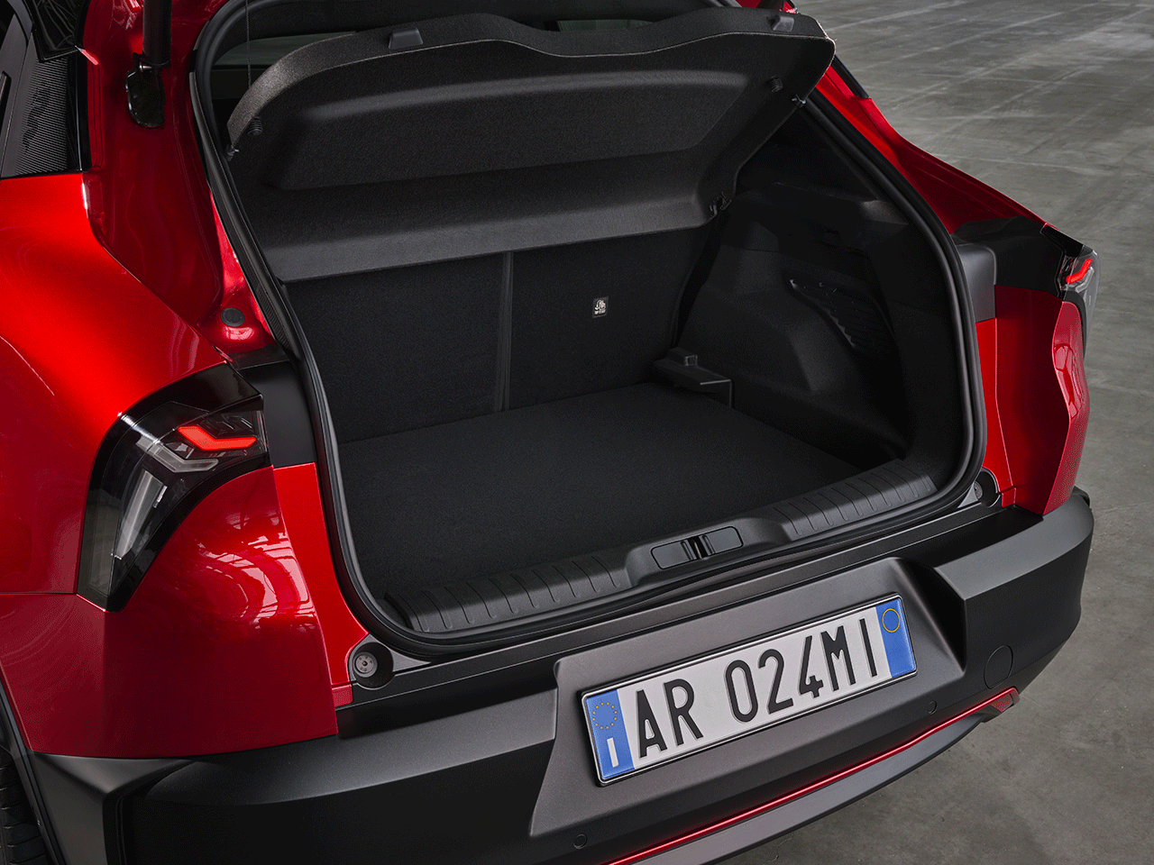 Jaunā Alfa Romeo Junior Elettrica bagāžas nodalījums ir aprīkots ar brīvroku režīmā vadāmu bagāžas nodalījuma aizvirtni, radot papildu komfortu un ērtības. Ar iespaidīgo 400 litru ietilpību tas ir lieliski pielāgots Jūsu vajadzībām. Papildus varat pielāgot bagāžas nodalījuma telpu ar regulējamā bagāžas nodalījuma grīdu, kam ir 3 līmeņi. Turklāt iekšpusē varat atrast ērtu 12V kontaktligzdu visām Jūsu uzlādes vajadzībām, sākot ar sīkrīkiem un beidzot ar elektriskajiem skrejriteņiem.