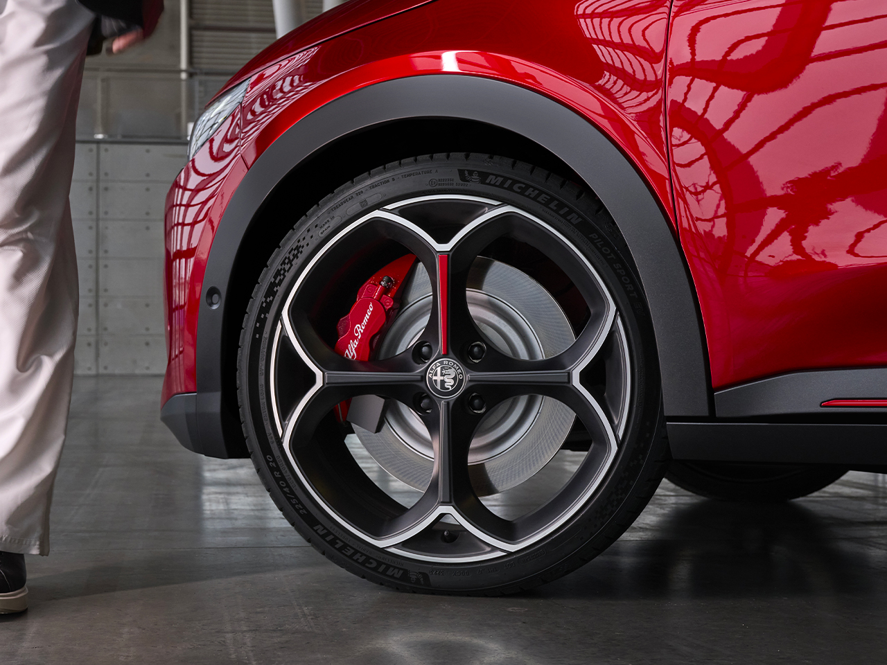 Patiesi sportiskais kompaktauto Alfa Romeo Junior Elettrica 240 ZS Veloce ir aprīkots ar 382 mm priekšējiem bremžu diskiem un četru virzuļu alumīnija bremžu suportiem. Dynamic braukšanas režīmā bremžu darbības efektivitāte ir precīzi noregulēta enerģiskai braukšanai, nodrošinot sportisku un atsaucīgu bremzēšanas efektu, kas lieliski saskan ar automobiļa aizraujošo dinamiku.
