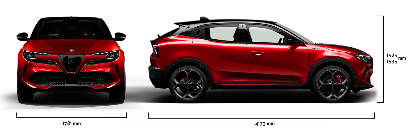 Alfa Romeo Junior Elettrica izmēri iemieso perfektu un sportisku kompaktauto ar garumu 4 173 mm un augstumu 1 535 mm (Veloce versijai 1 505 mm). Bagāžas nodalījums ar tā kopējo tilpumu līdz 400 litriem, piedāvā plašu bagāžas un mantu glabātavu, tādējādi padarot to par daudzpusīgu un praktisku izvēli gan braukšanai pa pilsētu, gan braucieniem pa šoseju. Turklāt varat izvēlēties starp 18" un 20" vieglmetāla diskiem.