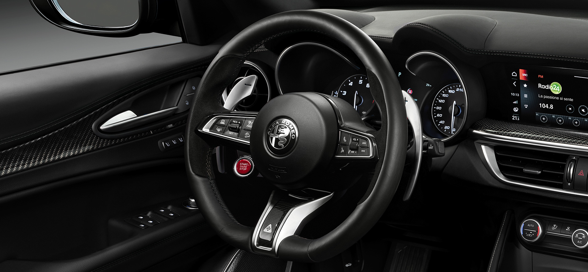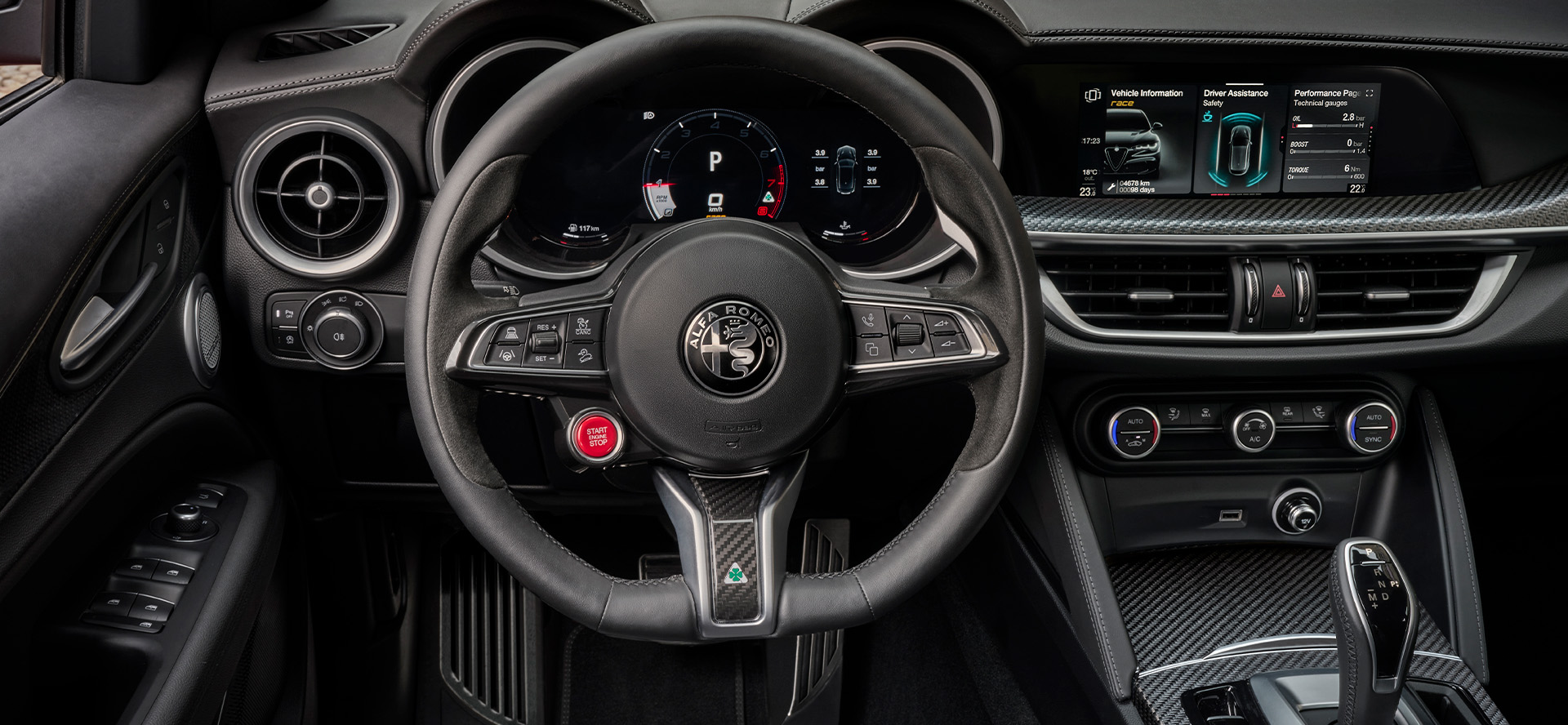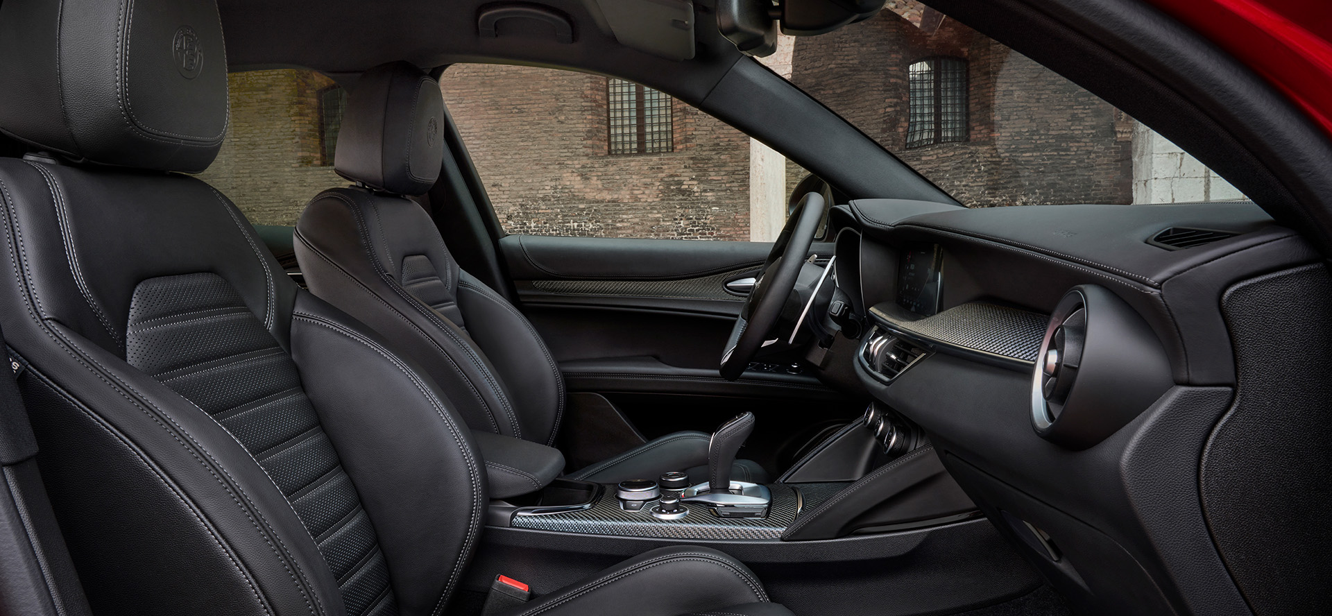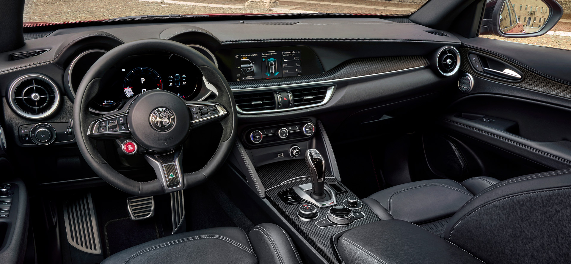 Stelvio Quadrifoglio interjera apdarē iezīmējas oglekļa šķiedras elementi un sportiska stila virsmas ar ādas apdari, radot vidi, kas aicina izbaudīt augstākā līmeņa sniegumu.