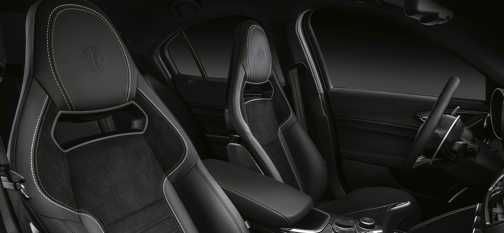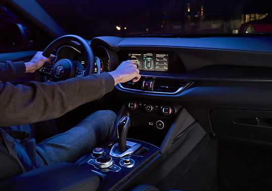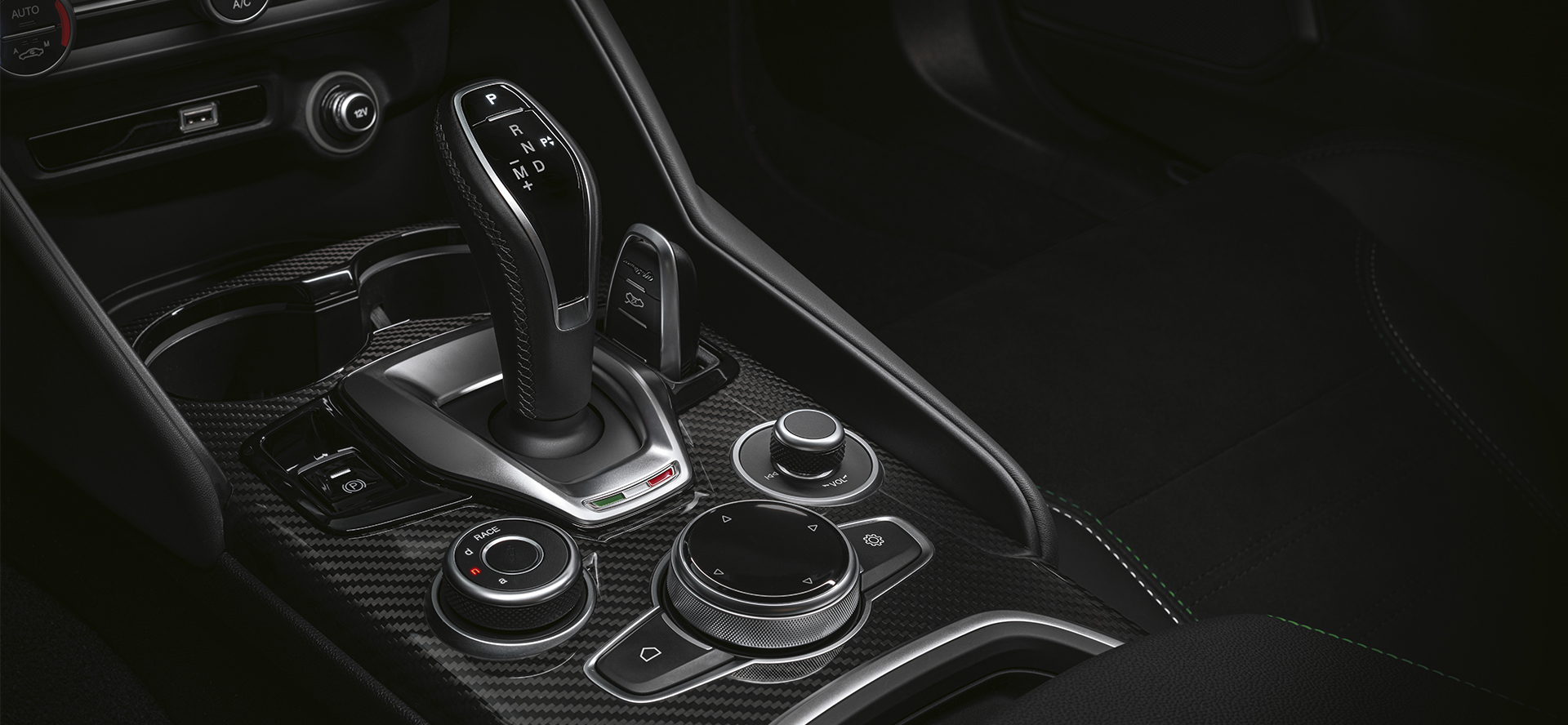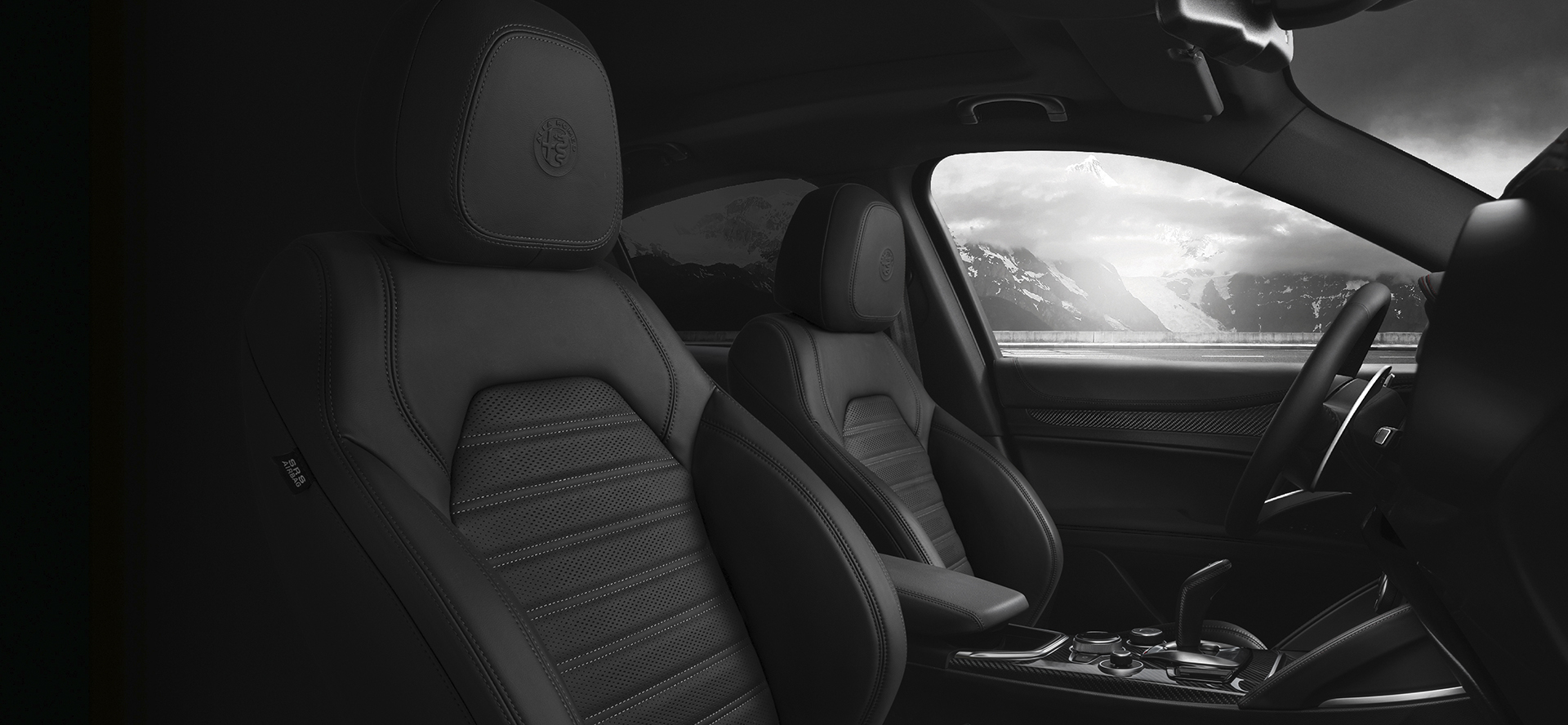Stelvio Quadrifoglio interjera apdarē iezīmējas oglekļa šķiedras elementi un sportiska stila virsmas ar ādas apdari, radot vidi, kas aicina izbaudīt augstākā līmeņa sniegumu.