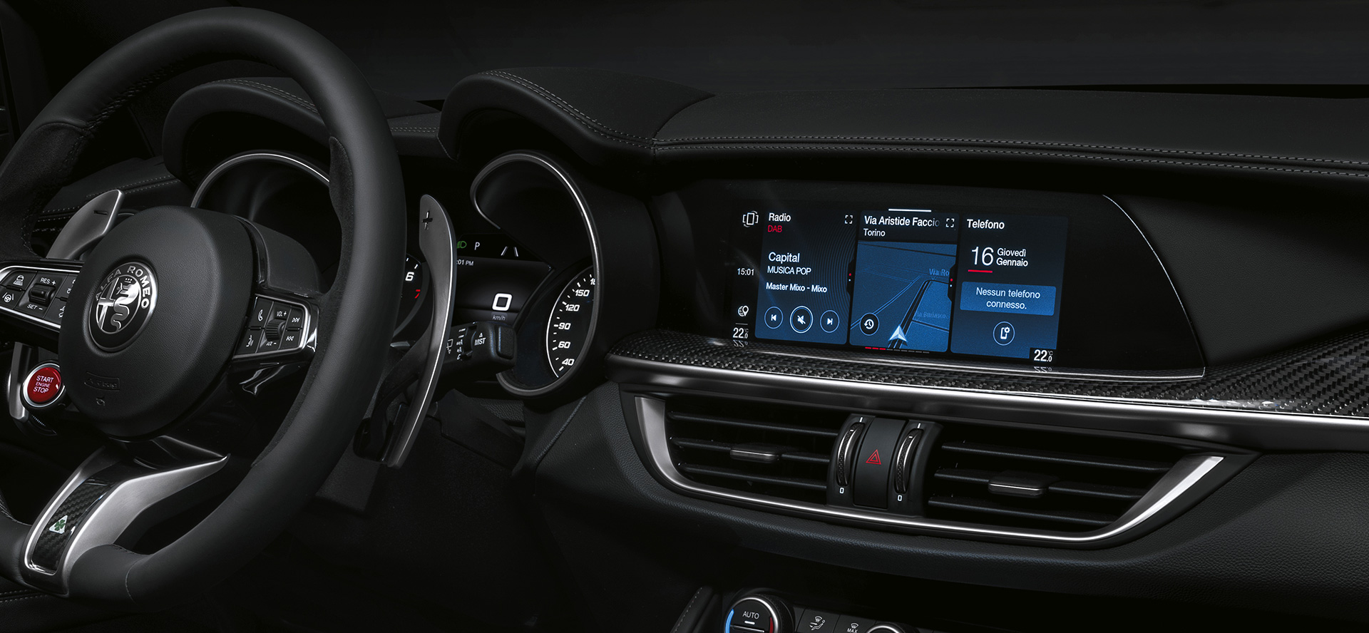 Alfa Romeo Stelvio Quadrifoglio informācijas un izklaides sistēmai ir 8,8 collu Multi-Touch ekrāns.
